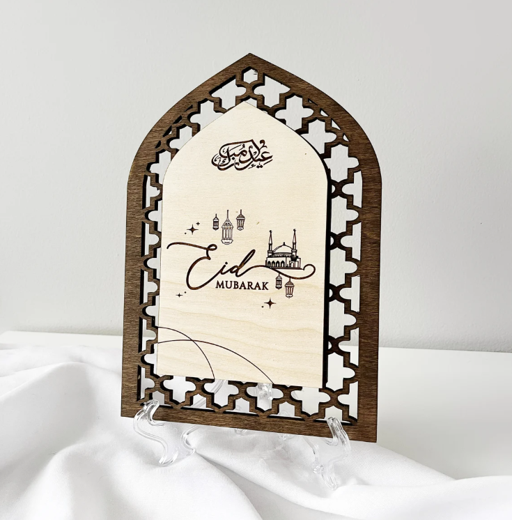 Crafted with a layered 3mm acrylic and 3mm plywood base, this beautifully balanced piece features delicate gold “Ramadan Mubarak” script against a warm neutral background. The circular design gives it a modern yet timeless feel, perfect for styling on shelves, consoles, coffee tables, or prayer spaces.