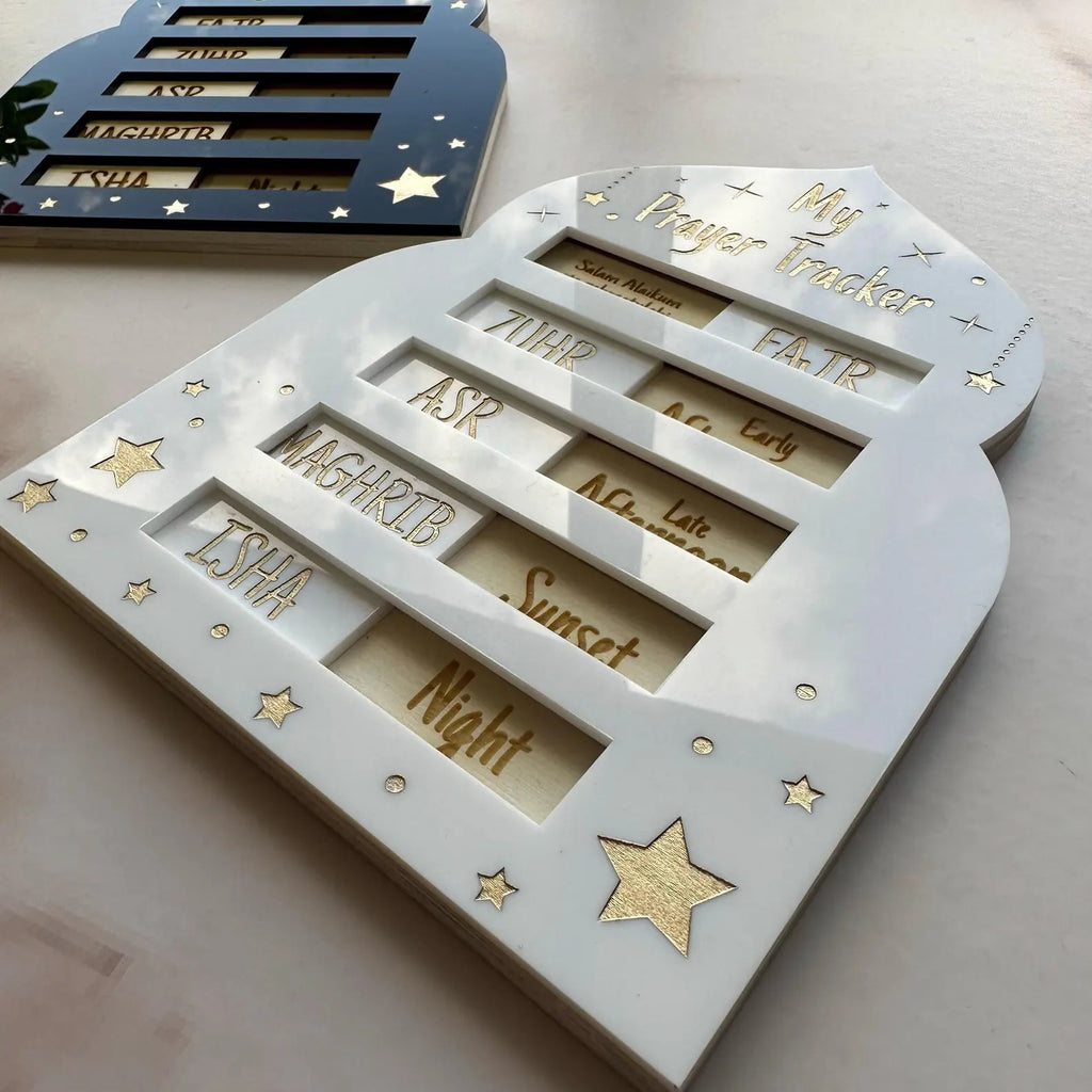 A beautiful wooden Salah tracker designed in a classic Islamic arch shape to help children and adults stay consistent with their daily prayers. Simply slide the markers across after each salah to visually track progress throughout the day.