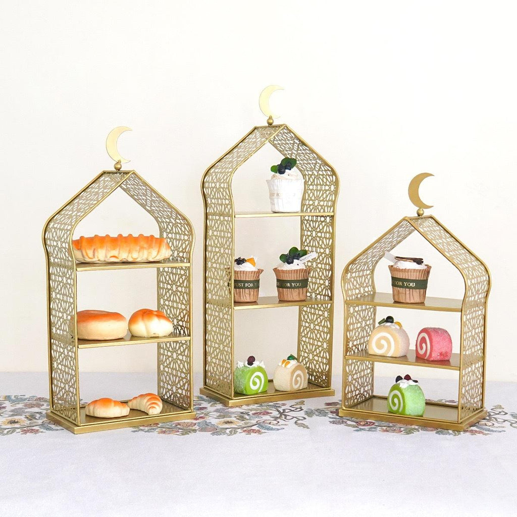 Perfect for presenting dates, desserts, cupcakes, favours, or small treats, each stand adds height, structure, and a luxurious Islamic aesthetic to your table décor. Whether used at home for iftar, Eid mornings, events, or gatherings, they transform simple food presentation into a memorable Ramadan experience.