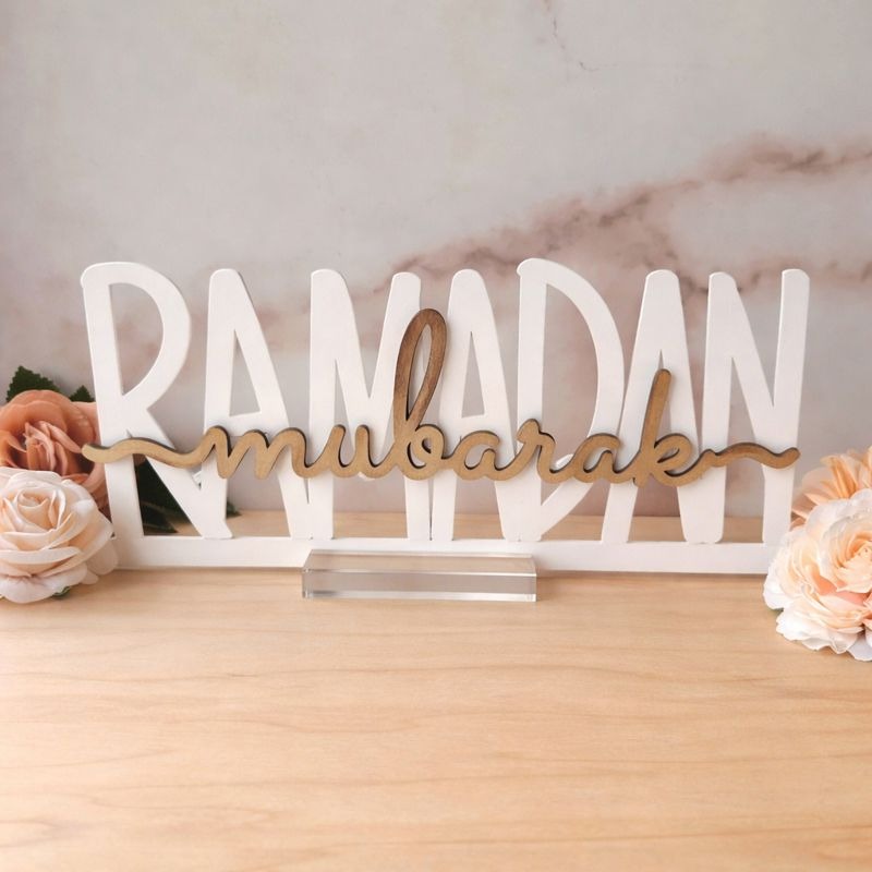 Ramadan Mubarak Calligraphy Decor – Wooden Islamic Table Sign